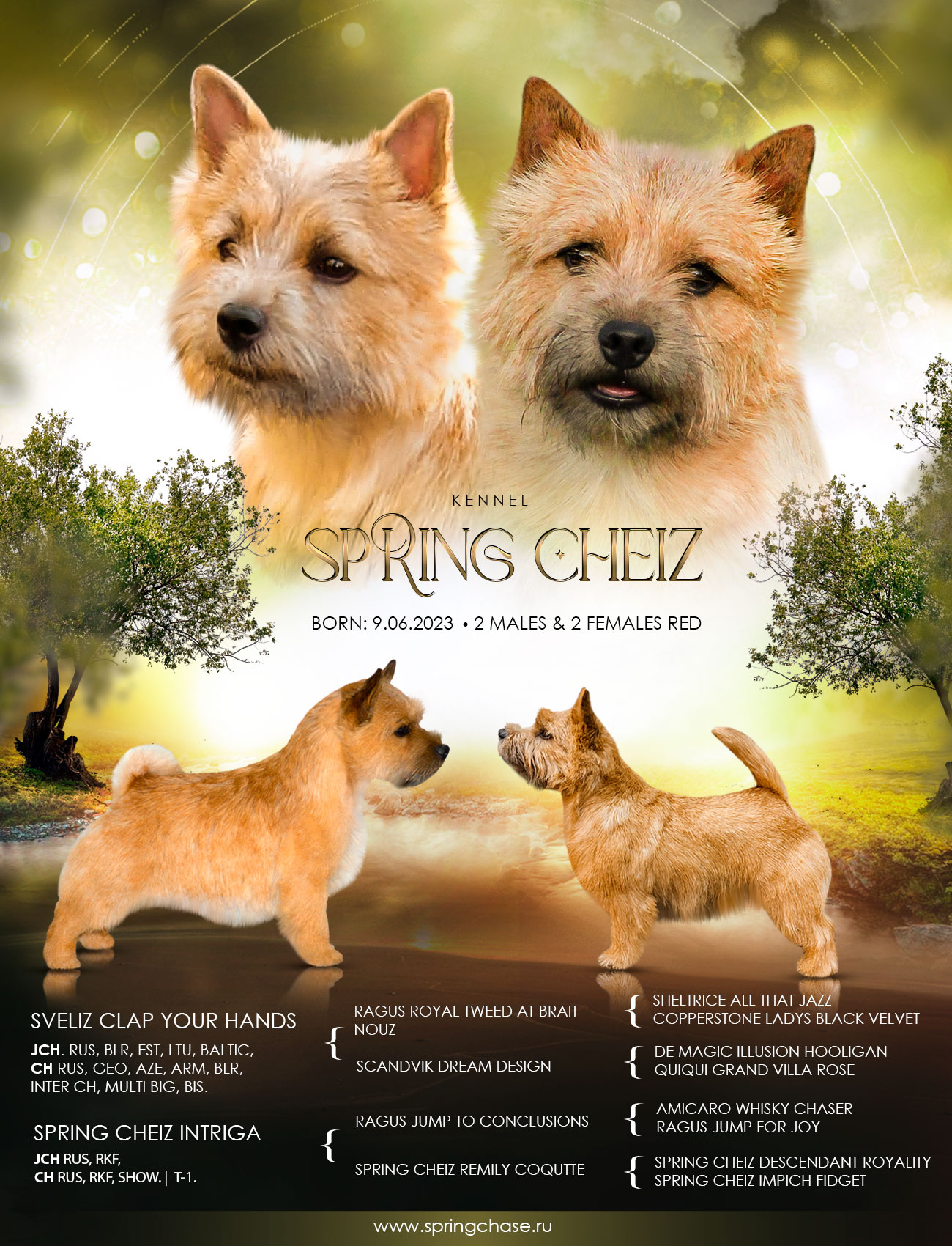Sire: C.I.B.,CH RUS,AZE,ARM,BLR,GEO,LVA,JCHRUS,BLR,LVA Sveliz Clap Your Hands Dam: CCH RUS,CH RUS,JCH RUS,SHCH RUS,CH RKF,JCH RKF,BCH RUS.T1 Spring Cheiz Intriga